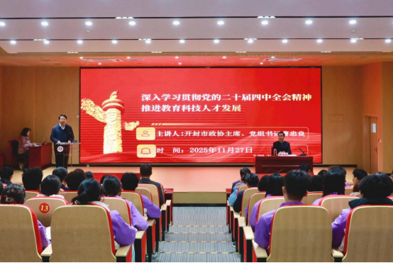 11月27日上午,开封市政协主席、党组书记曹忠良走进我校,就深入学习贯彻党的二十届四中全会精神进行专题宣讲。开封市政协秘书长、党组成员孙振廷,开封市委教育工委专职副书记、市教体局二级巡视员耿振勇,校党委书记闫俊山,党委副书记、工会主席陈君丽,党委副书记、开封校区管委会主任魏新华,副校长、开封校区管委会副主任常新中,学校相关部门负责同志和师生代表近200人参加此次宣讲会。宣讲会由闫俊山主持。