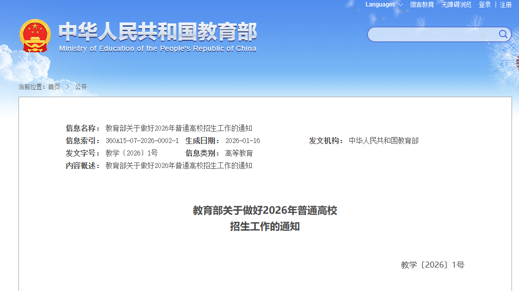 教育部关于做好2026年普通高校招生工作的通知