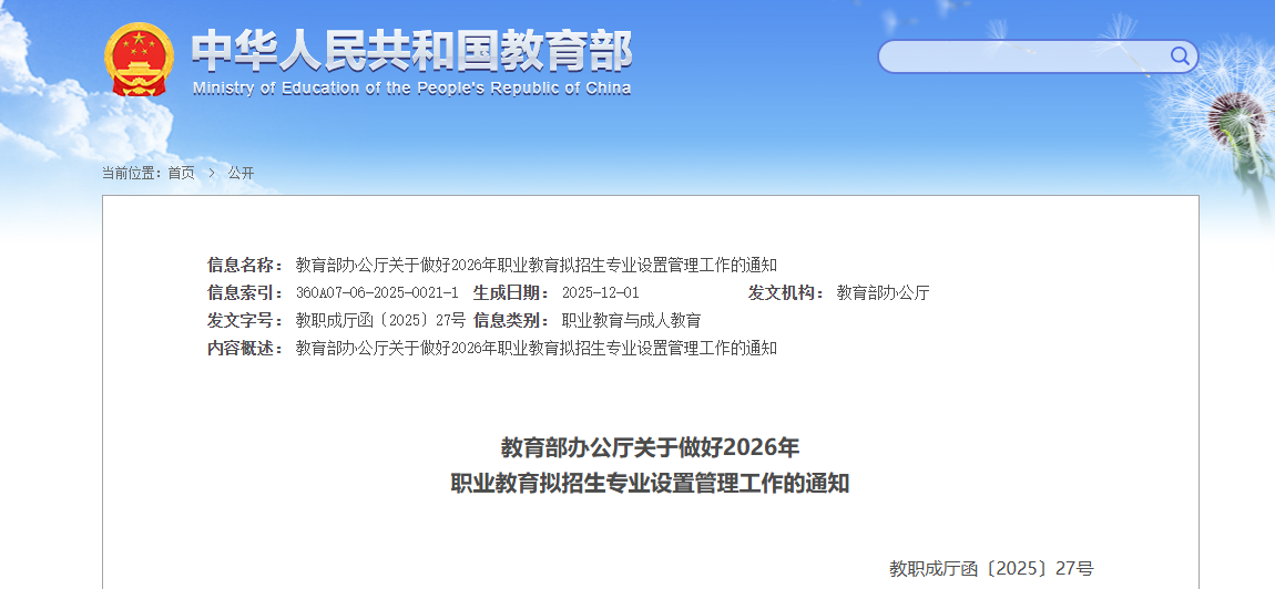 教育部办公厅关于做好2026年职业教育拟招生专业设置管理工作的通知