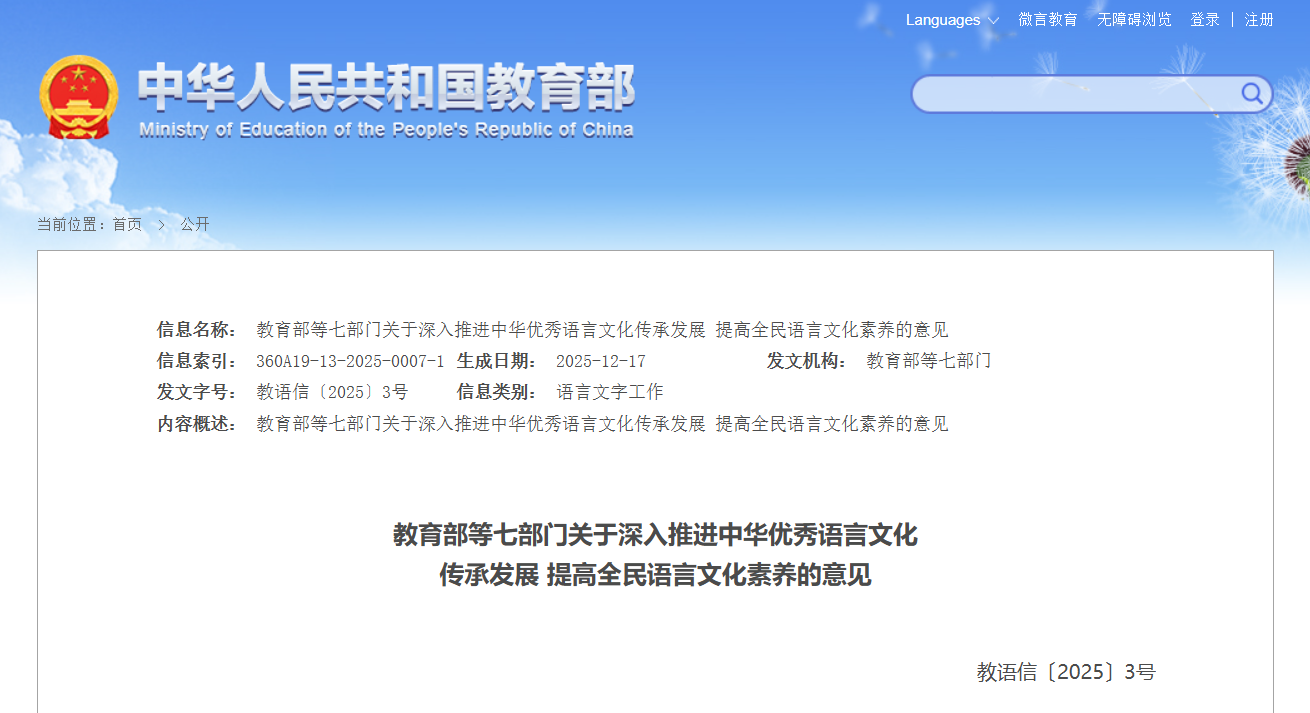 近日,教育部、国家语委、中央宣传部、中央网信办、文化和旅游部、国家文物局、共青团中央印发《关于深入推进中华优秀语言文化传承发展提高全民语言文化素养的意见》(以下简称《意见》)。