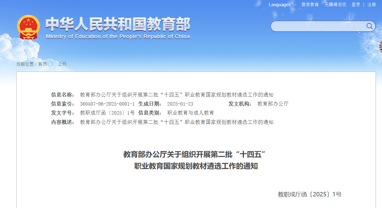 为深入贯彻全国教育大会精神,进一步加强教材建设和管理,根据《“十四五”职业教育规划教材建设实施方案》要求,现就第二批“十四五”职业教育国家规划教材遴选工作通知如下。