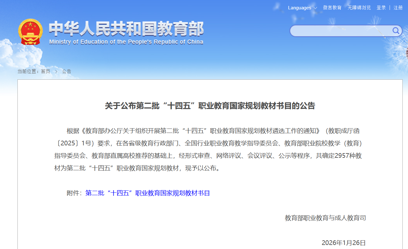 根据《教育部办公厅关于组织开展第二批“十四五”职业教育国家规划教材遴选工作的通知》(教职成厅函〔2025〕1号)要求,在各省级教育行政部门、全国行业职业教育教学指导委员会、教育部职业院校教学(教育)指导委员会、教育部直属高校推荐的基础上,经形式审查、网络评议、会议评议、公示等程序,共确定2957种教材为第二批“十四五”职业教育国家规划教材,现予以公布。