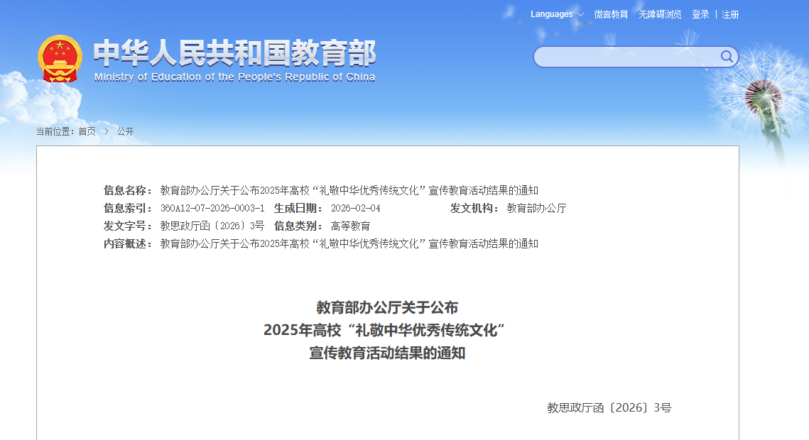 教育部办公厅关于公布2025年高校“礼敬中华优秀传统文化”宣传教育活动结果的通知