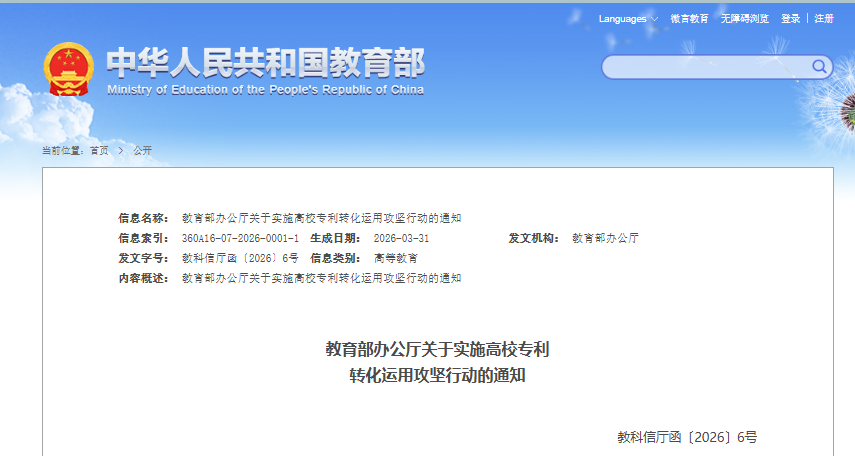 专利是高校科技成果的重要形式,推动专利转化运用是提升高校科技成果转化效能的关键抓手。为深入贯彻落实《教育强国建设规划纲要(2024—2035年)》,全面提升高校专利转化运用能力,让更多科技成果尽快转化为现实生产力,决定实施高校专利转化运用攻坚行动。现将有关事项通知如下。