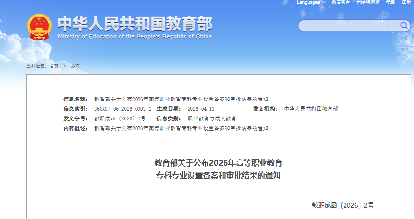 教育部关于公布2026年高等职业教育专科专业设置备案和审批结果的通知
